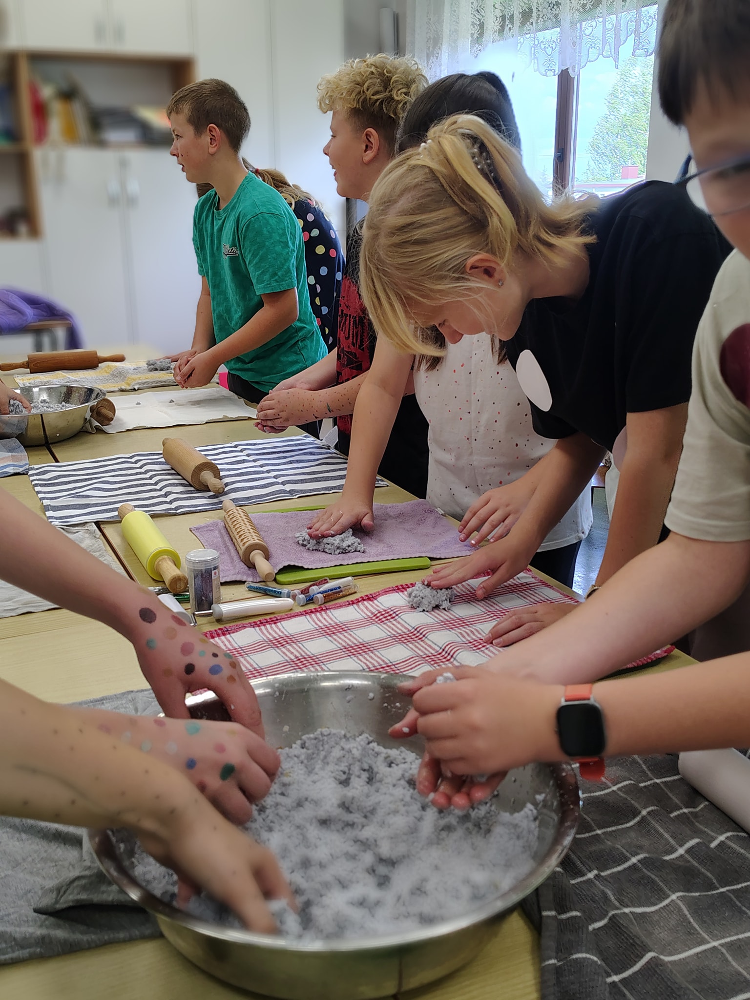 Na lekcji techniki uczniowie klasy 5 mieli okazję przenieść się w dawne czasy i sami czerpali papier. Własnoręcznie przygotowali niepowtarzalne arkusze. Było trochę wody, sporo cierpliwości i mnóstwo radości – a efekty ich pracy są naprawdę wyjątkowe!