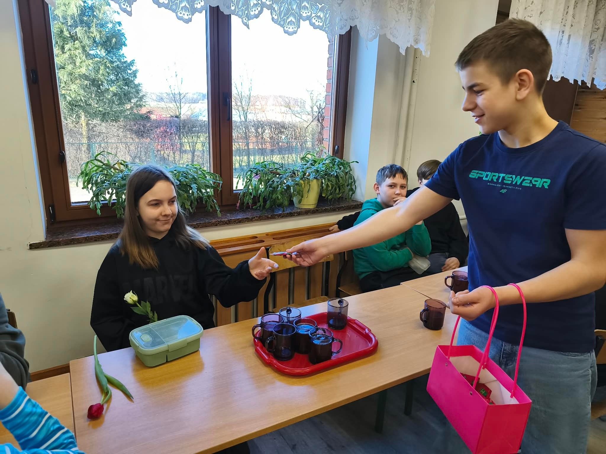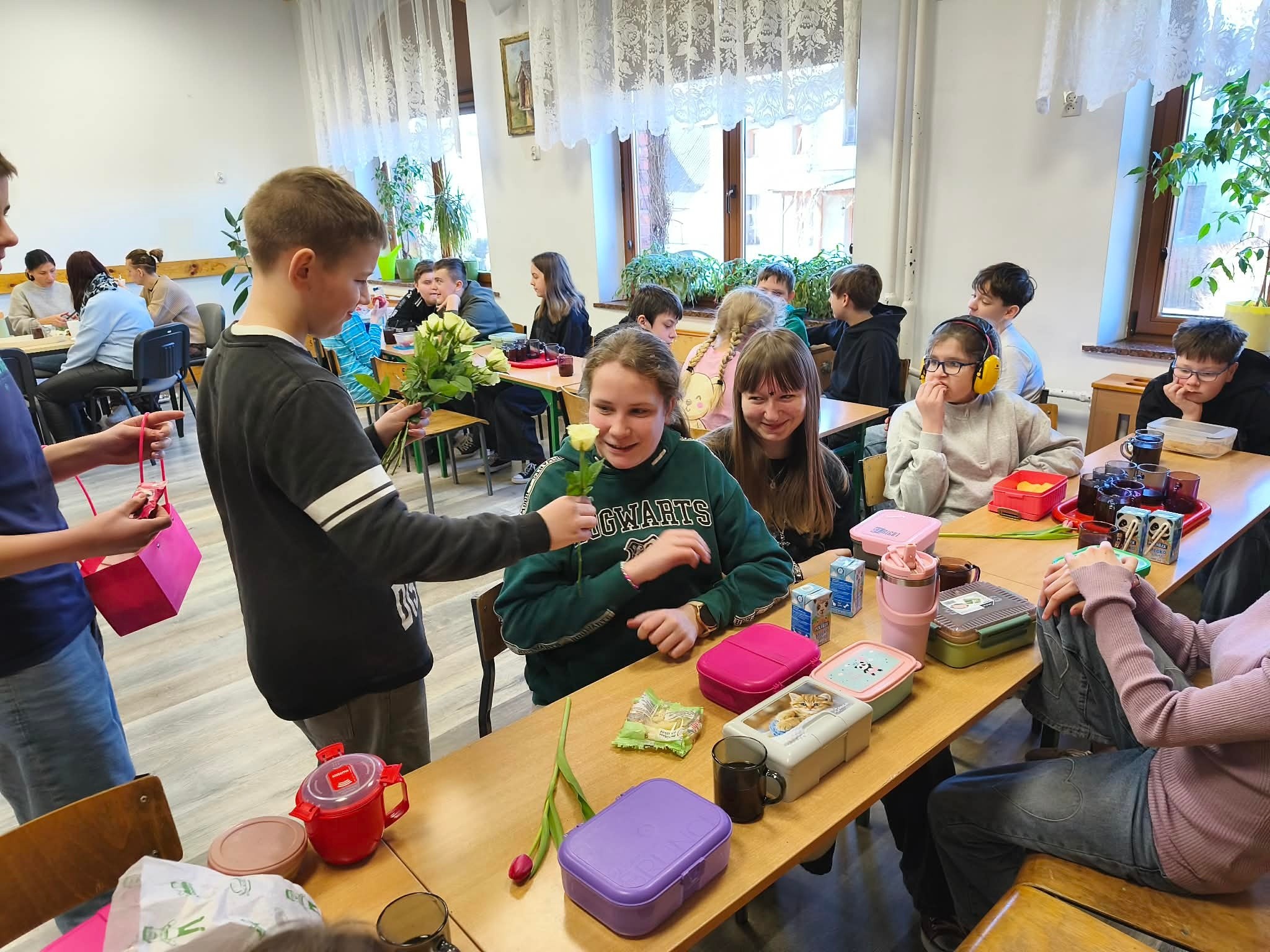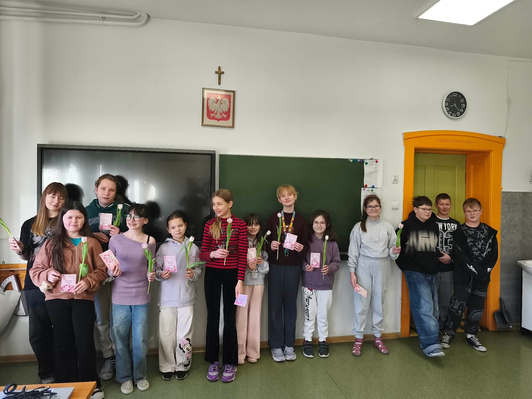 Nasi chłopcy złożyli Paniom najserdeczniejsze życzenia z okazji Dnia Kobiet. Wręczyli kwiaty oraz słodkie upominki, wywołując wiele uśmiechów.