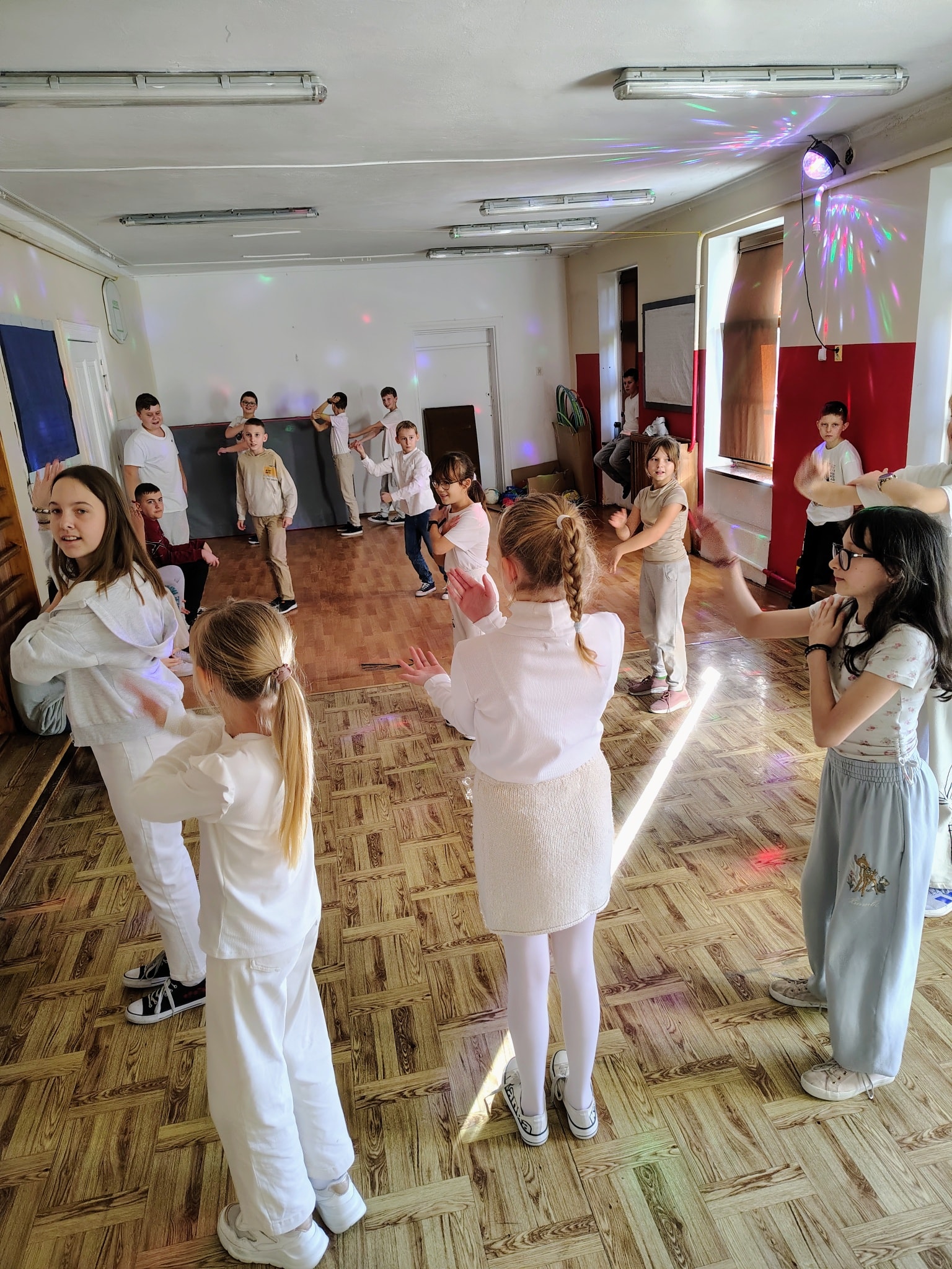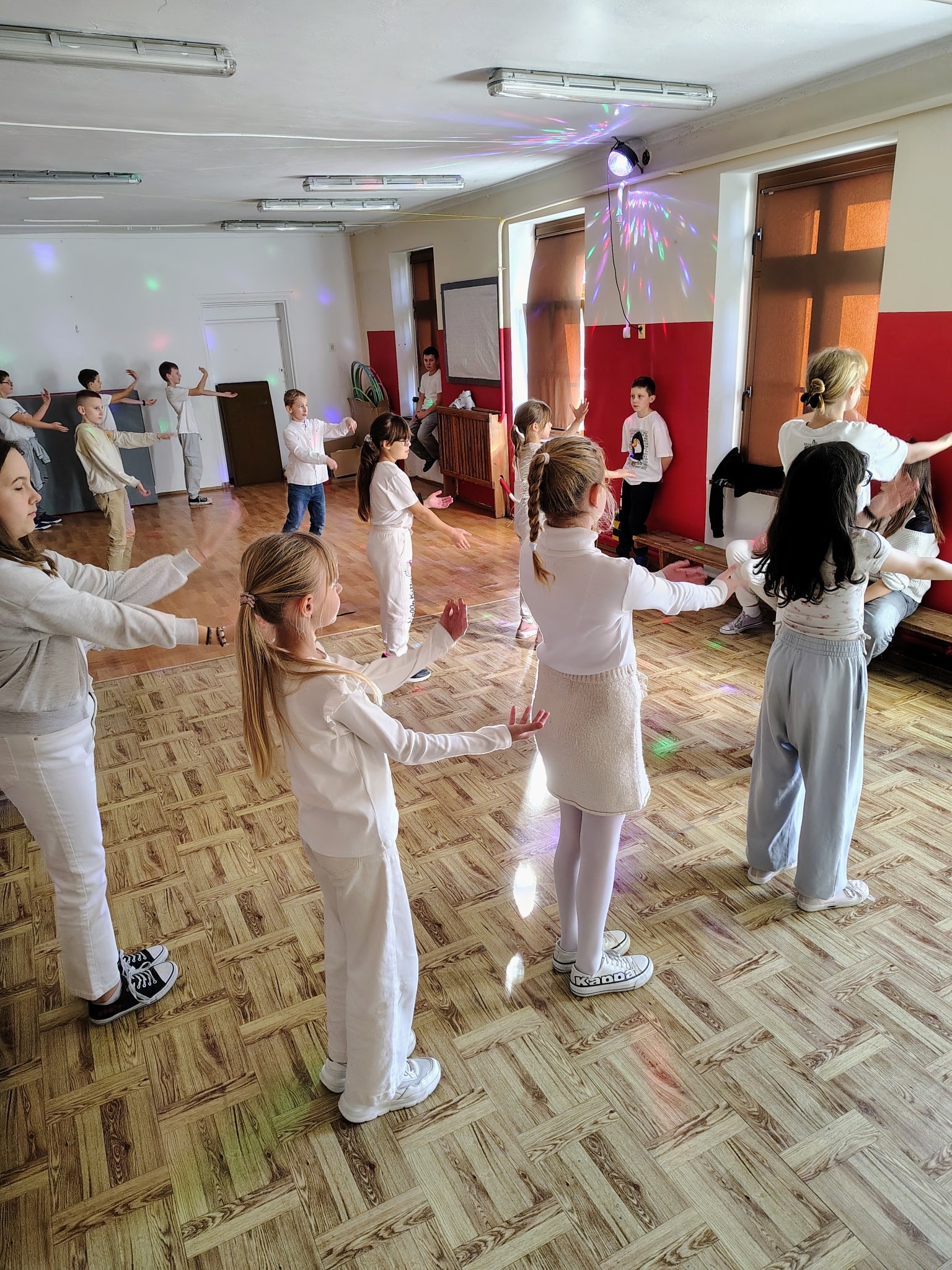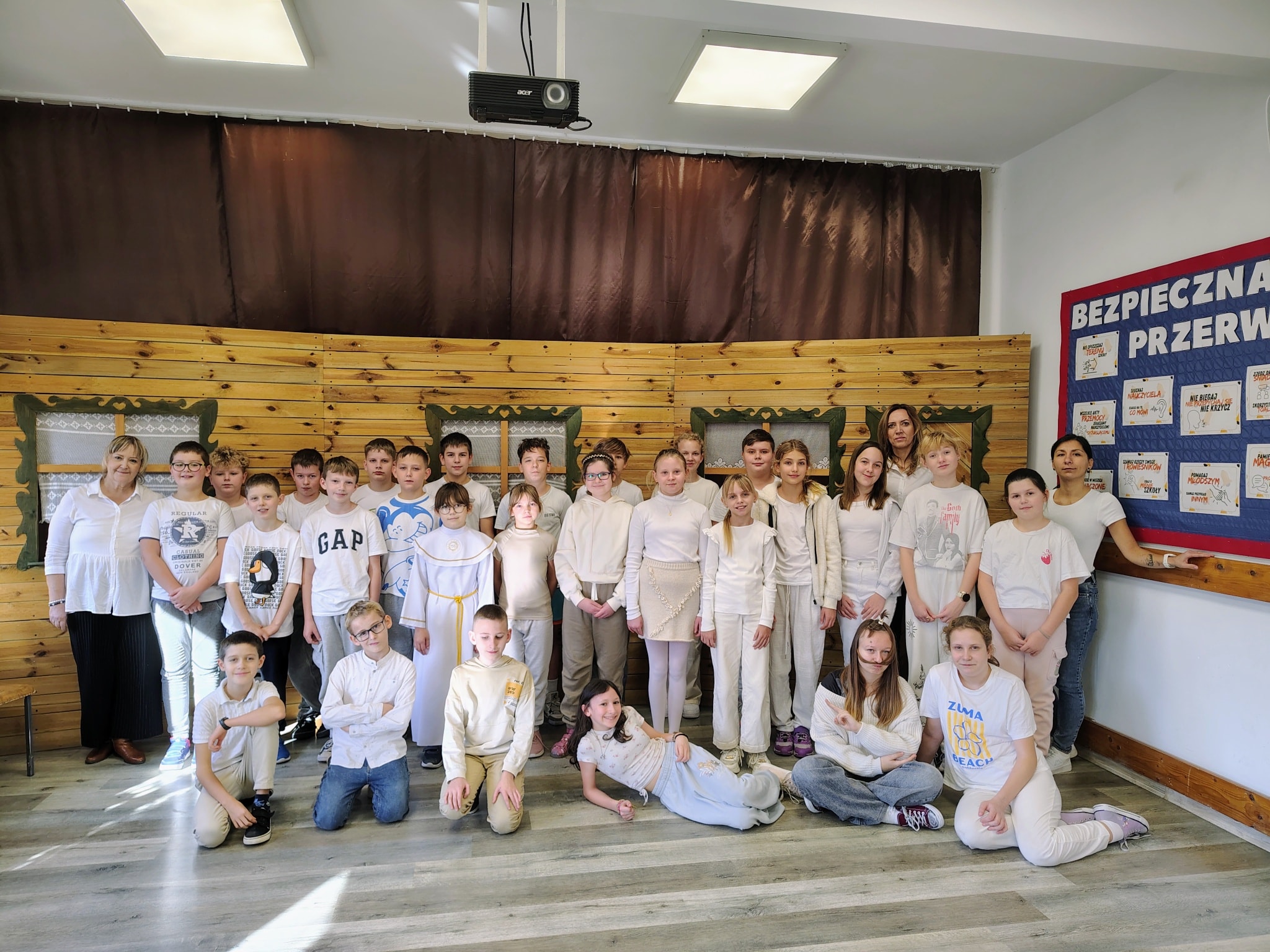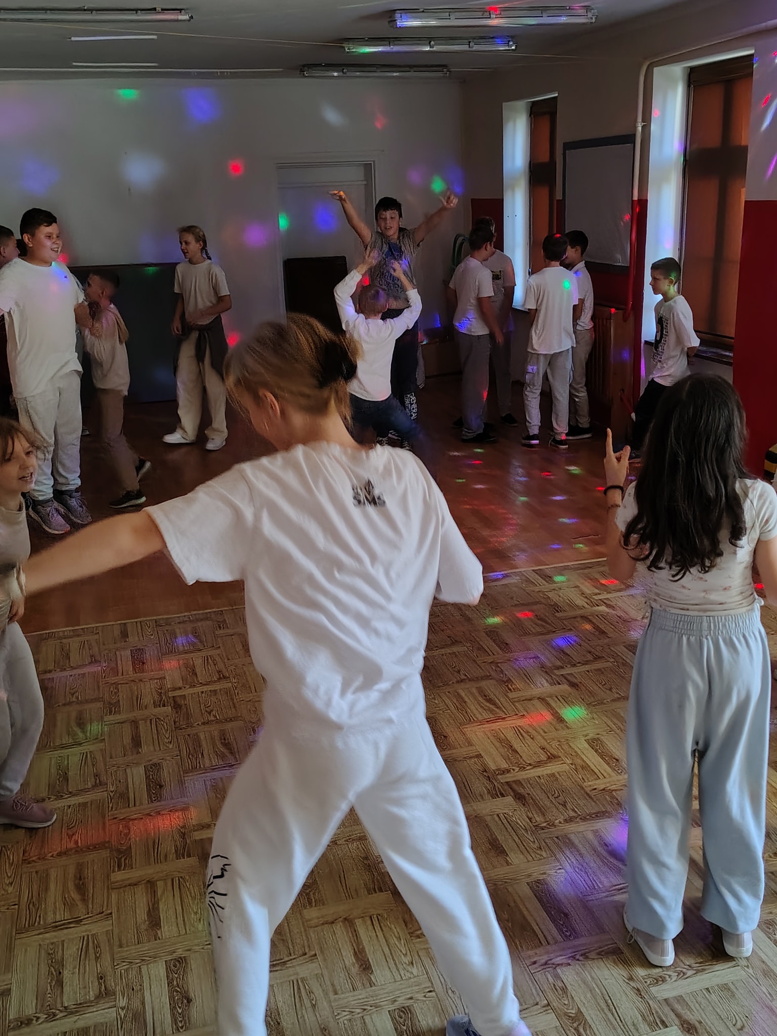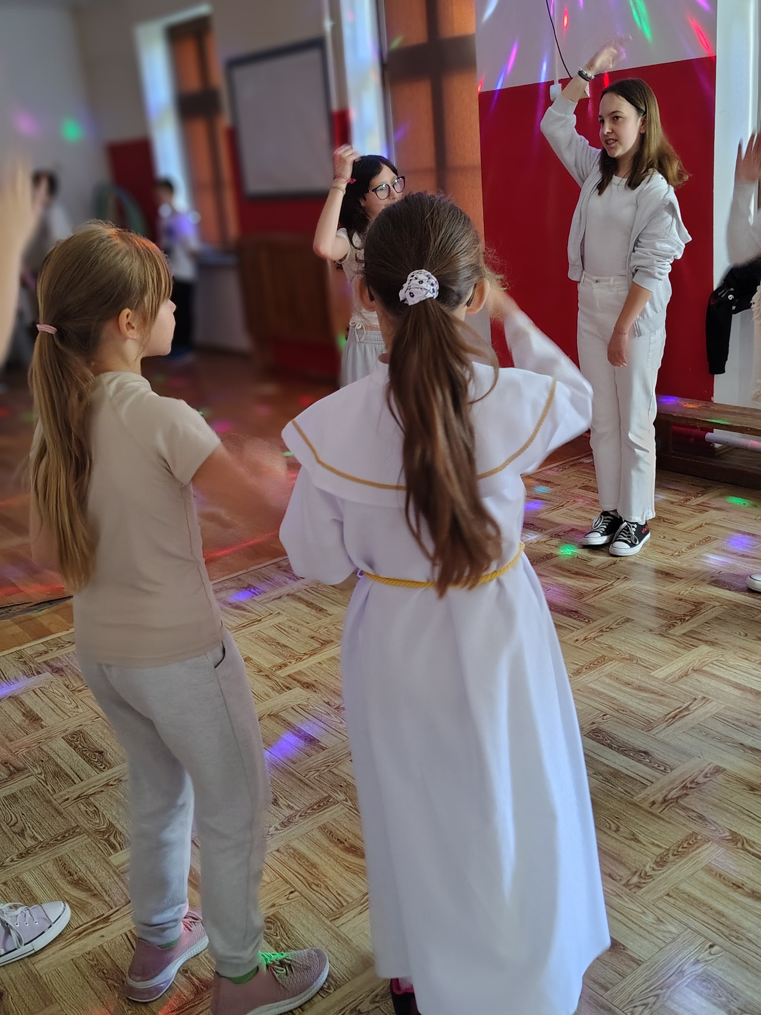 Wspaniała atmosfera, pełna uśmiechu i pozytywnej energii, udzieliła się wszystkim. Dzieci z entuzjazmem bawiły się przy popularnych piosenkach, takich jak "Taki mały, taki duży" czy "Góry do góry", a taniec i śpiew wypełniły szkolne korytarze. Był to czas wspólnej zabawy i radosnego celebrowania wartości, które nas łączą.