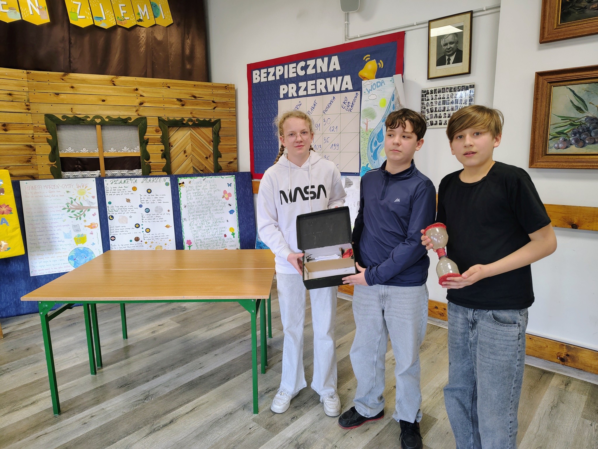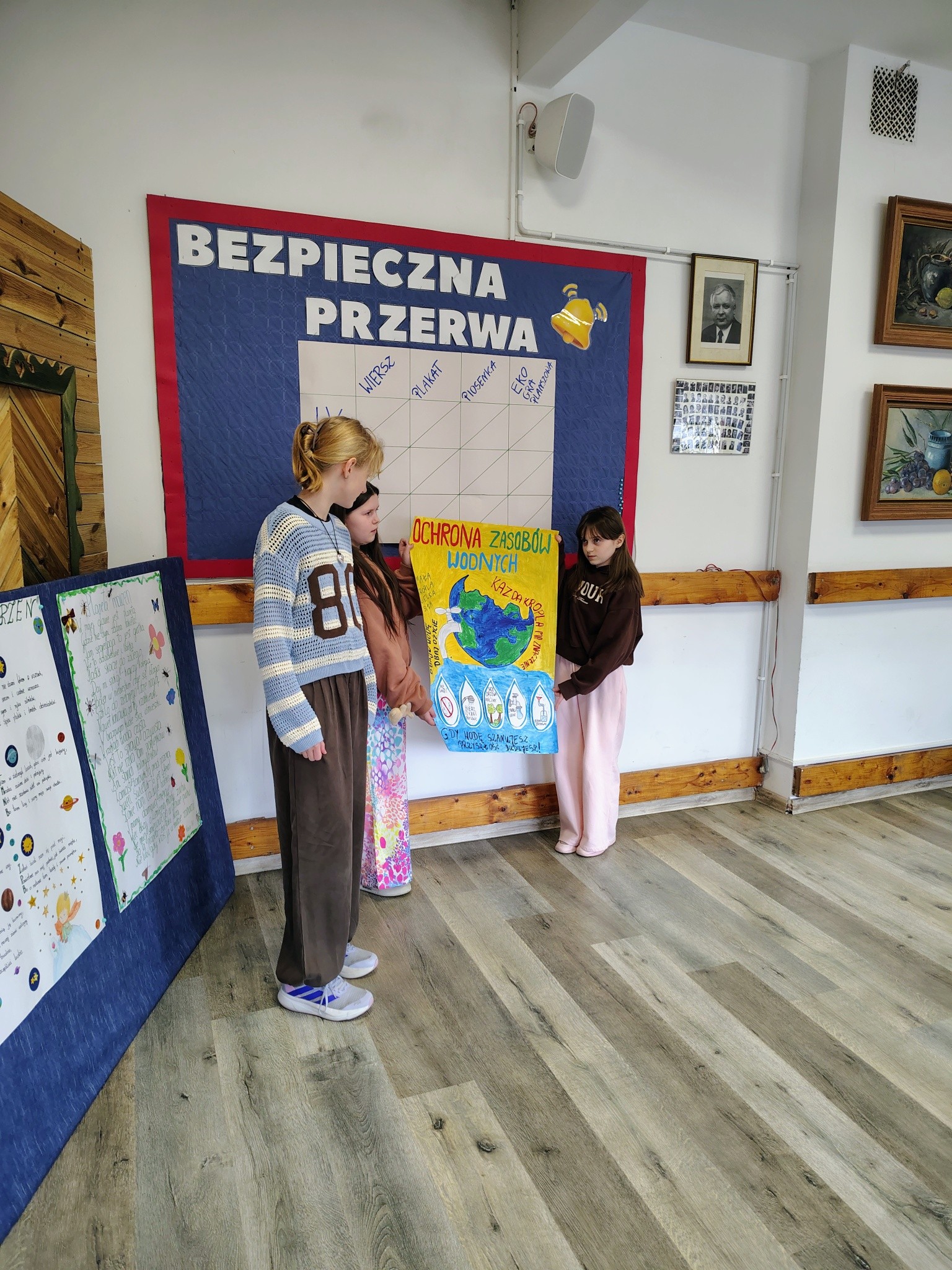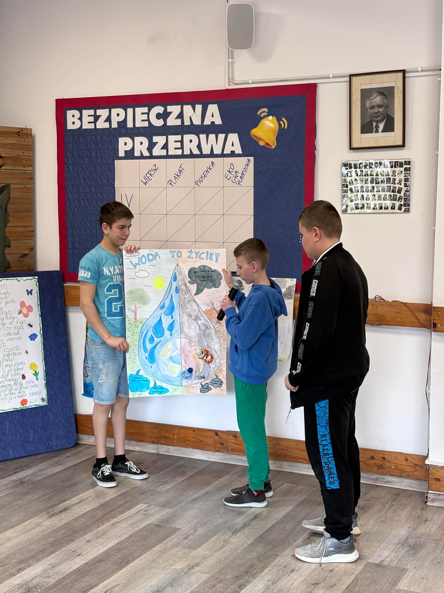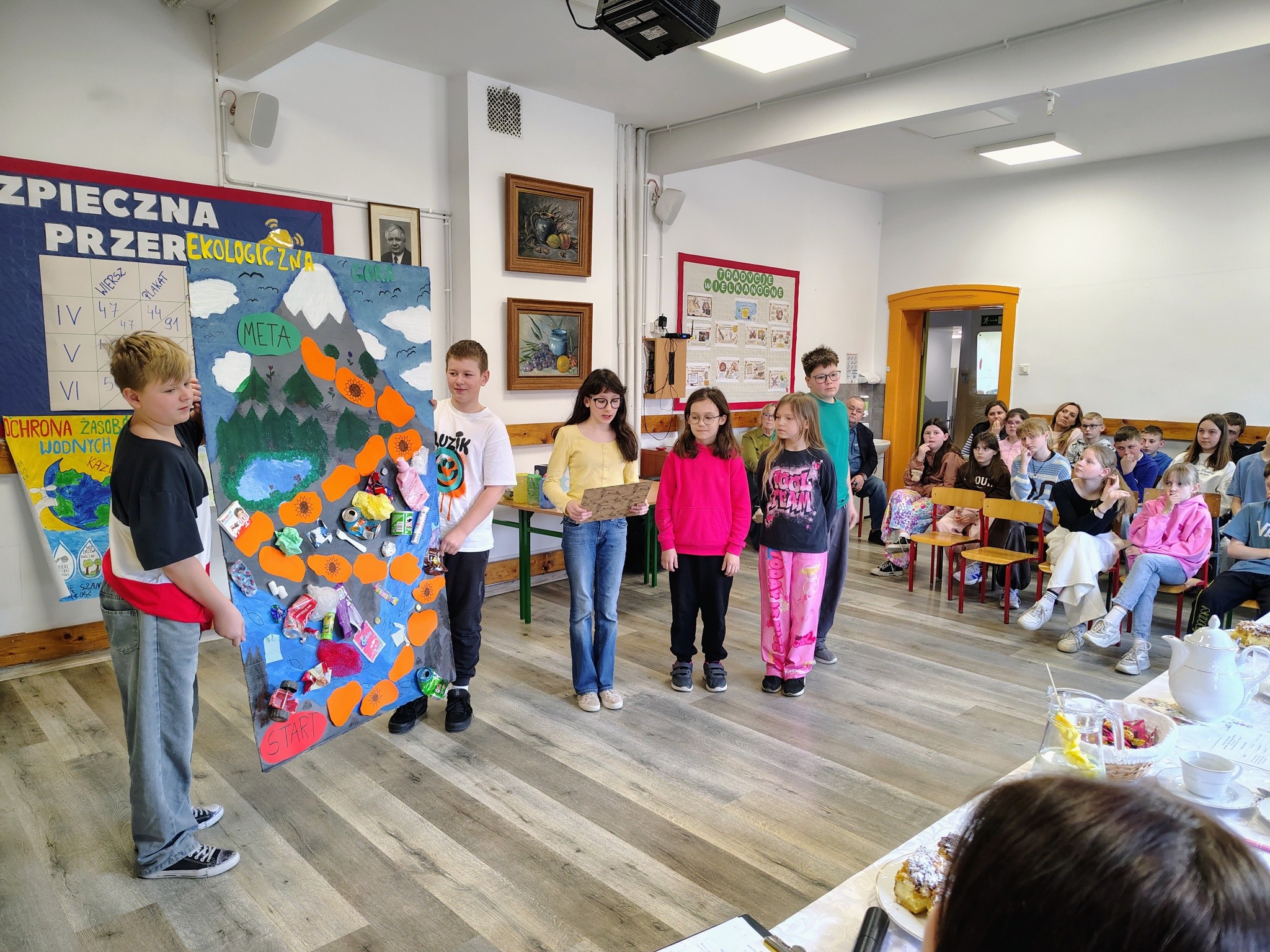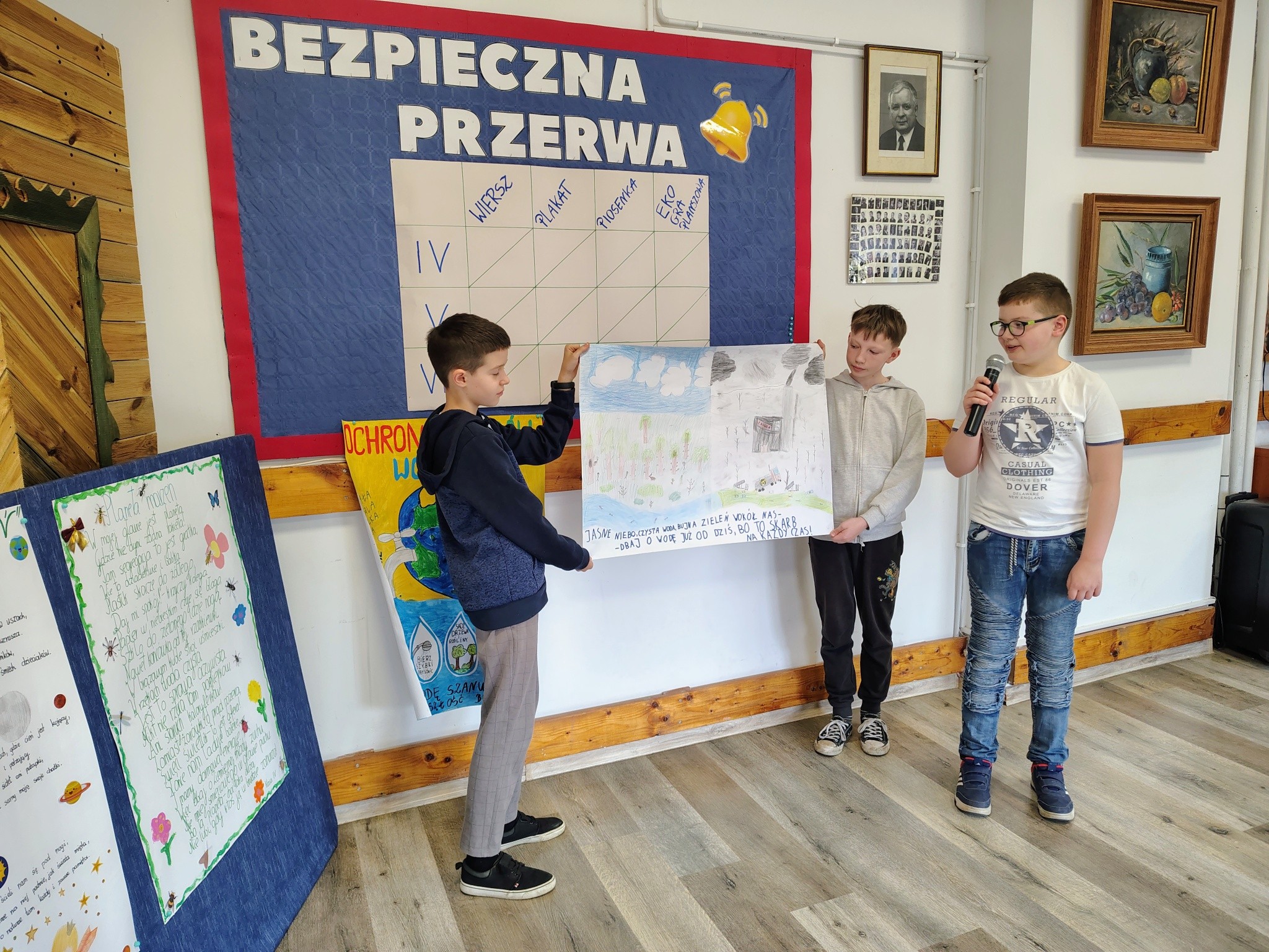 recytowali wiersze pt. „Planeta marzeń”, prezentowali plakaty na temat ochrony zasobów wodnych, wykonywali piosenki zachęcające do dbania o środowisko i zbierania śmieci, a także stworzyli własne eko gry planszowe.