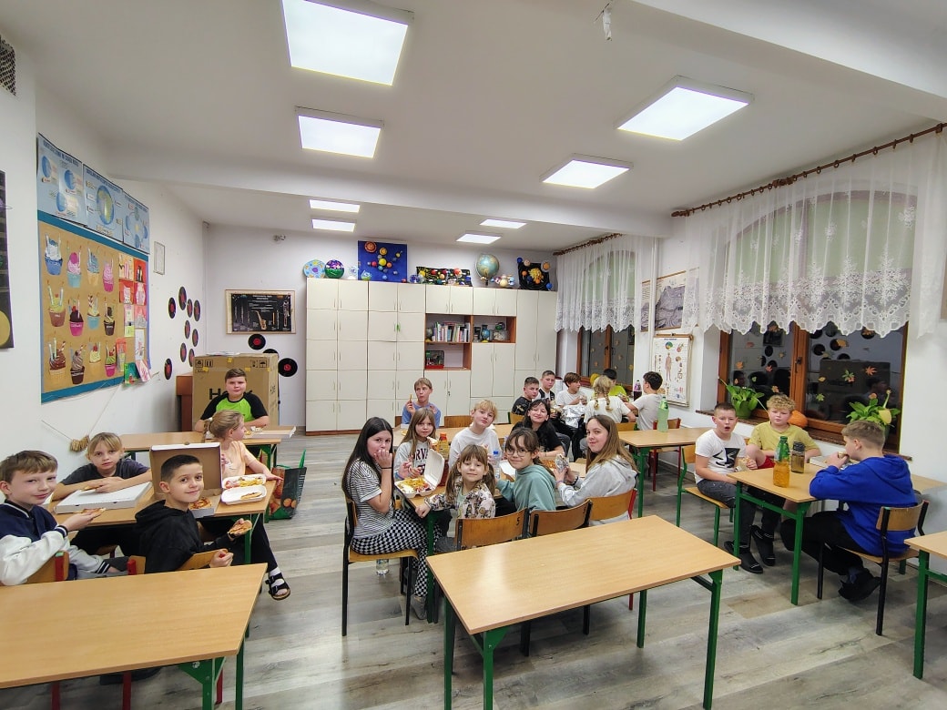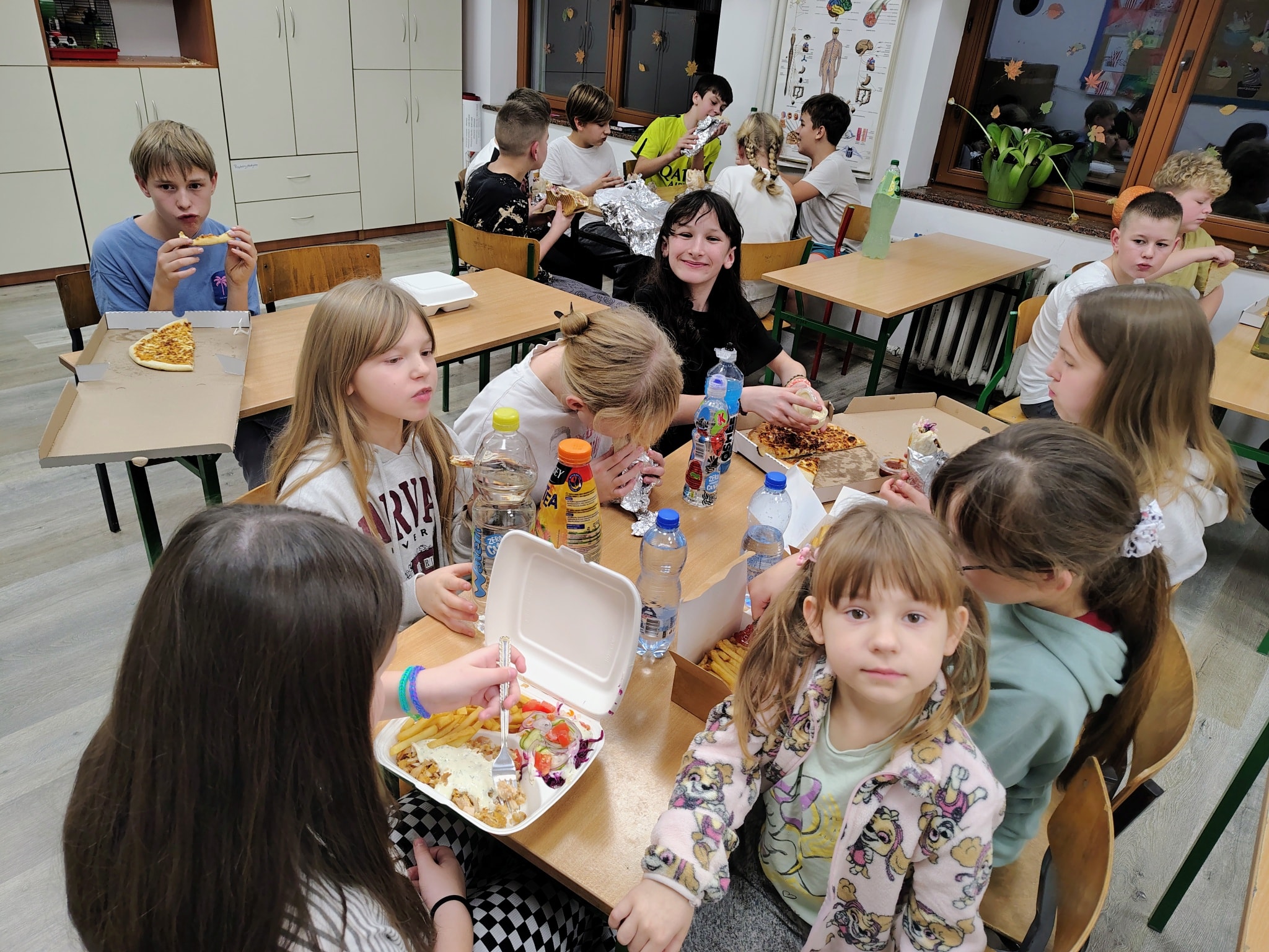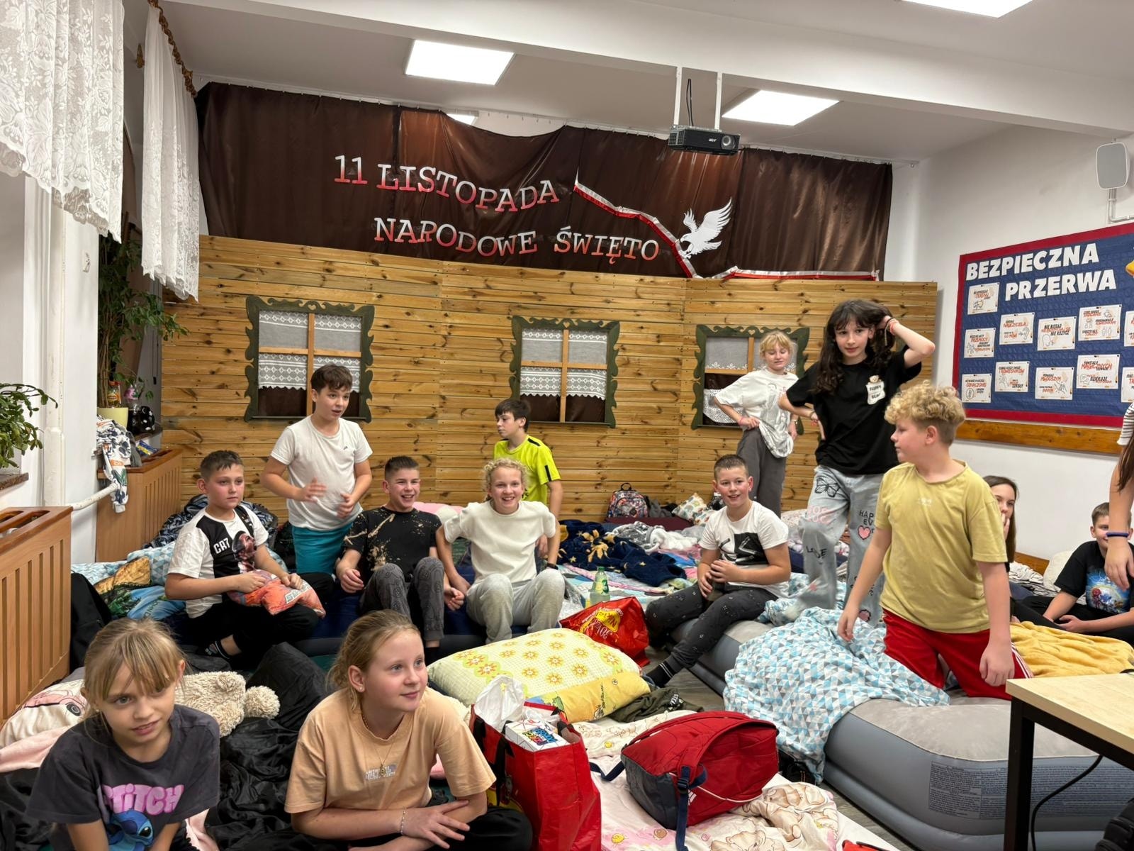 Jak co roku odbyła się szkolna nocowanka dla uczniów klas IV–VI Na dzieci czekało mnóstwo gier i zabaw oraz wspólna kolacja Zamówione kebaby i pizze z lokalnego baru u Anula były strzałem w dziesiątkę. Dziękujemy za pyszne jedzenie, wszystkim smakowało Po kolacji oglądaliśmy filmy To była świetnie spędzona noc, pełna wrażeń