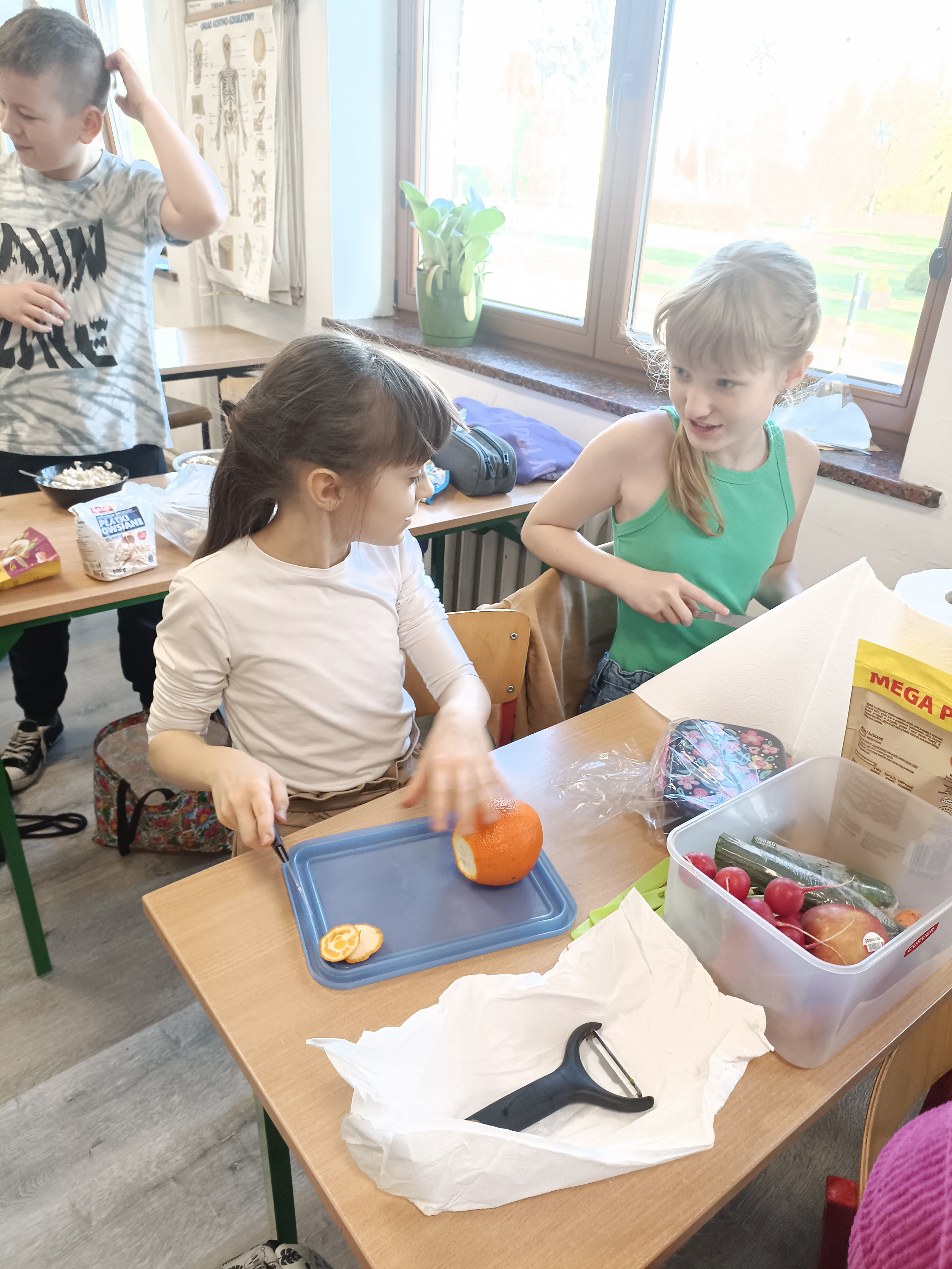 Uczniowie klasy szóstej i czwartej na zajęciach Wychowania do życia w rodzinie przygotowali na drugie śniadanie zdrowe przekąski. Celem zajęć było kształcenie u dzieci postaw prozdrowotnych poprzez uczenie zasad zdrowego odżywiania oraz przekazywanie wiedzy na temat produktów służących zdrowiu i produktów dla zdrowia szkodliwych. Nie zabrakło smacznej sałatki owocowej, sałatki warzywnej , pysznej wody z cytryną i pomarańczą oraz tortilli. Wykonanie posiłku sprawiło wiele radości. Smacznego !